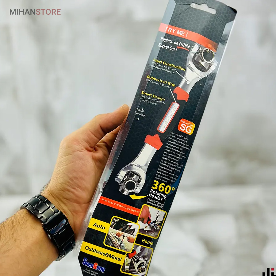علاوه بر این، دسته لاستیکی ضد لغزش آن نیز به شما کمک می‌کند تا هنگام استفاده از این محصول، کنترل بیشتری بر روی ابزار داشته باشید و با لغزش مواجه نشوید.طراحی کوچک و کم‌وزن آچار همه کاره تایگر، یکی دیگر از مزایای این ابزار است. این ویژگی باعث می‌شود که حمل و نقل آن بسیار آسان باشد و شما بتوانید این آچار را به راحتی در جیب یا کیف خود قرار دهید و در هر زمان که نیاز به استفاده دارید، به راحتی از آن بهره‌مند شوید. همچنین، قابلیت چرخش ۳۶۰ درجه در سرهای آچار به شما این امکان را می‌دهد تا حتی در فضاهای بسیار محدود و دسترسی سخت به پیچ‌ها، به راحتی کار خود را انجام دهید.