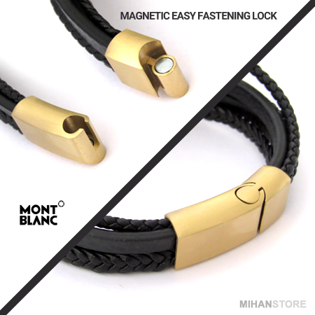 دستبند چرم طرح Montblanc نمونه‌ای از زیورهای ظریف و در عین حال پرطرفدار از جانب آقایان و خانم ها است که با اکثر رنگ‌های لباس همخوانی داشته و در عین حال متفاوت دیده می‌شود. این دستبند فوق العاده شیک از پنج لایه چرم به صورت ساده و بافته شده و نماد زیبای برند Montblanc با رنگ های لوگو مشکی و طلایی عرضه شده است.